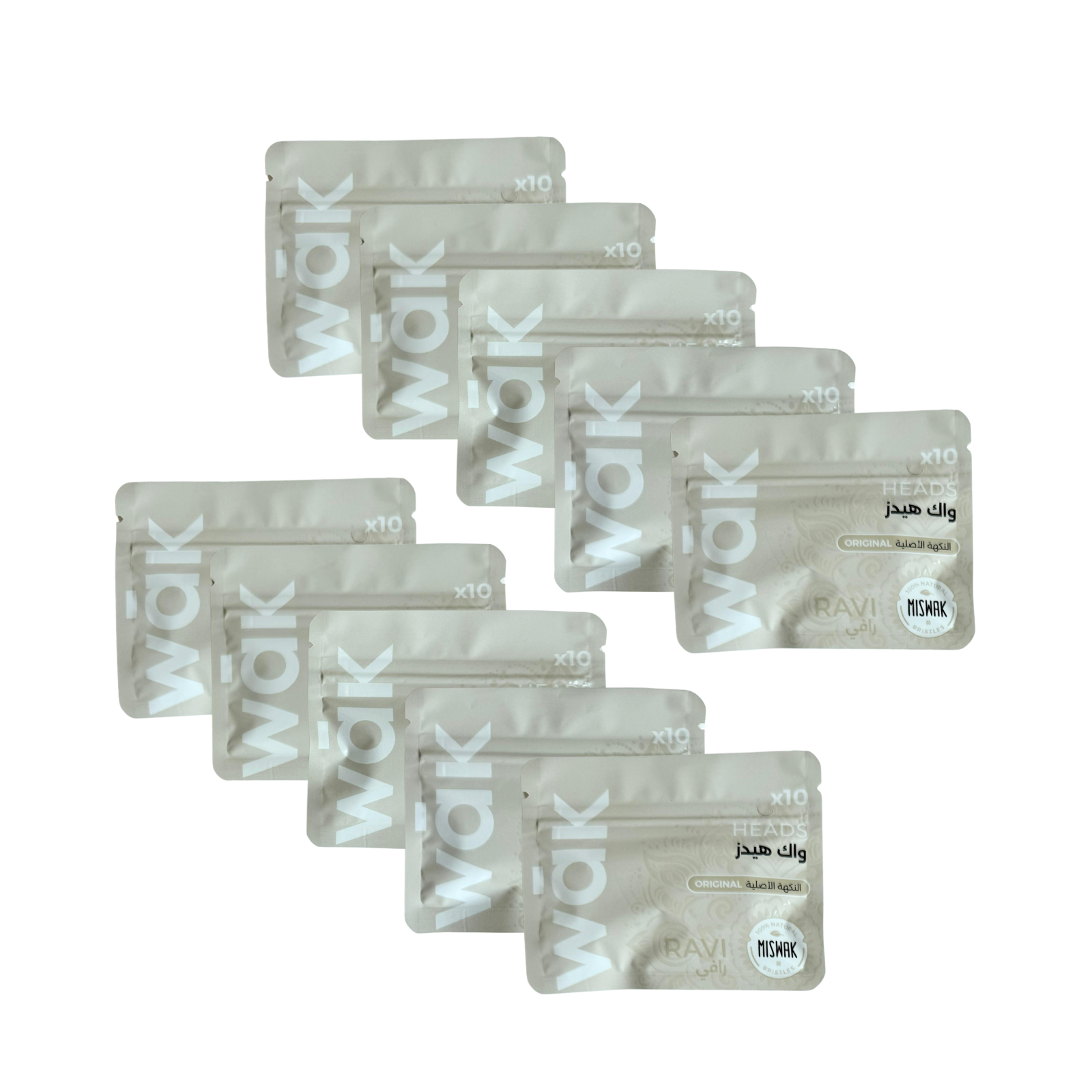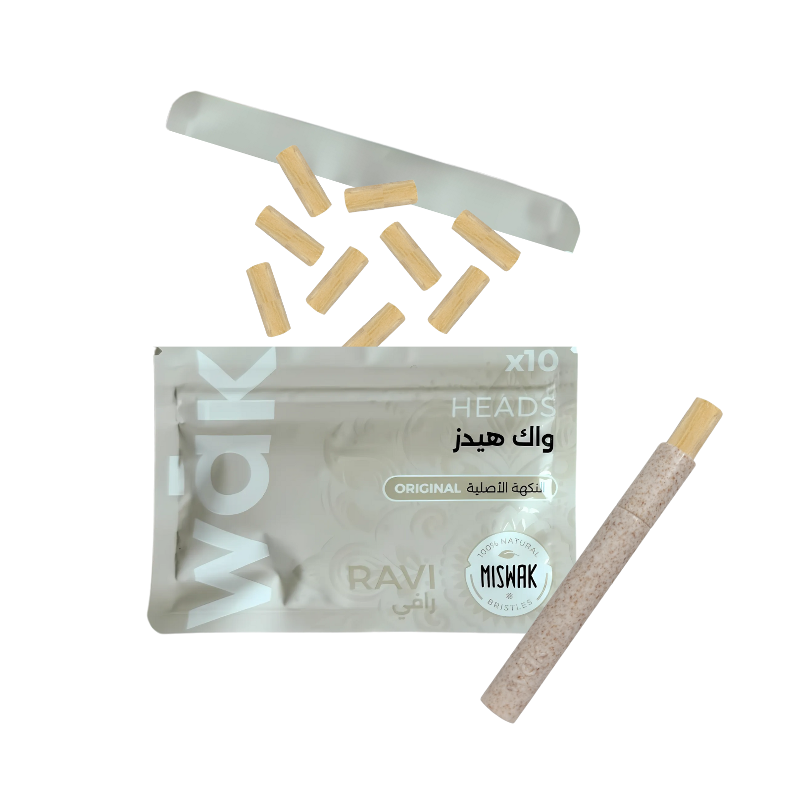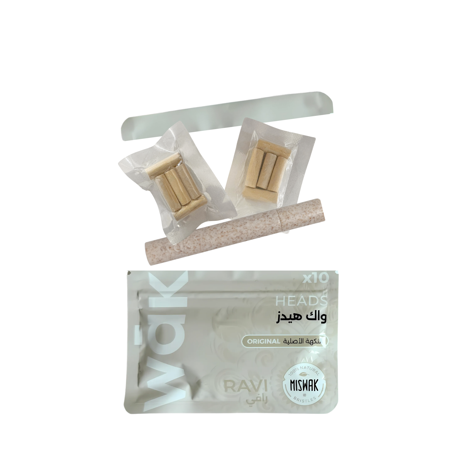 wāk Heads Ravi: A Heritage Rooted in Pakistan. Crafted from the Ravi strain of miswak, grown and harvested in Pakistan, these biodegradable heads bring ancient oral care into your daily rhythm. The Ravi strain is prized for its natural freshness and balanced texture, making it ideal for everyday use. Each pouch includes a biodegradable sampler stick, allowing anyone to experience wāk heads on the go—even without owning a wāk Stick. This makes the pouch both a refill pack for wāk Stick users, as well as a standalone pack (with the sampler stick) for on-the-go ease or for first-timers to the ritual. Natural. Portable. Timeless.